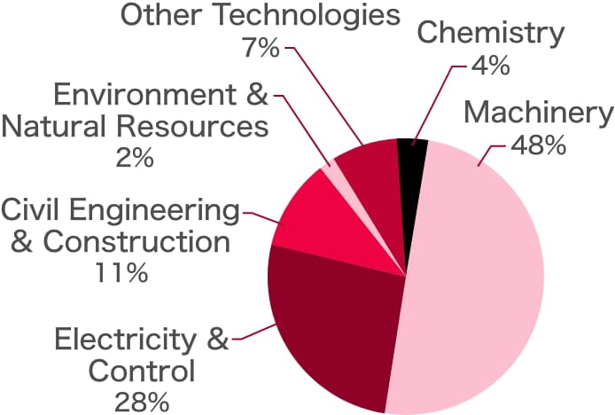 We have 48% of maintenance engineers in machinery, 28% in electricity and control, 11% in civil engineering and construction, and 4% in chemistry. Utilizing technologies in each specialization forconstruction of new plants and expansion and enhancement of existing ones, we handle everything, including design, construction, and aftercare.