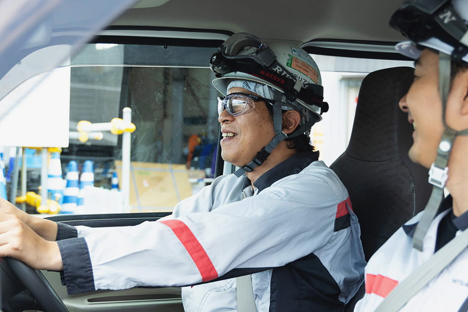 出勤。現場の1日は、ラジオ体操で始まります。朝礼で今日の作業を確認します。