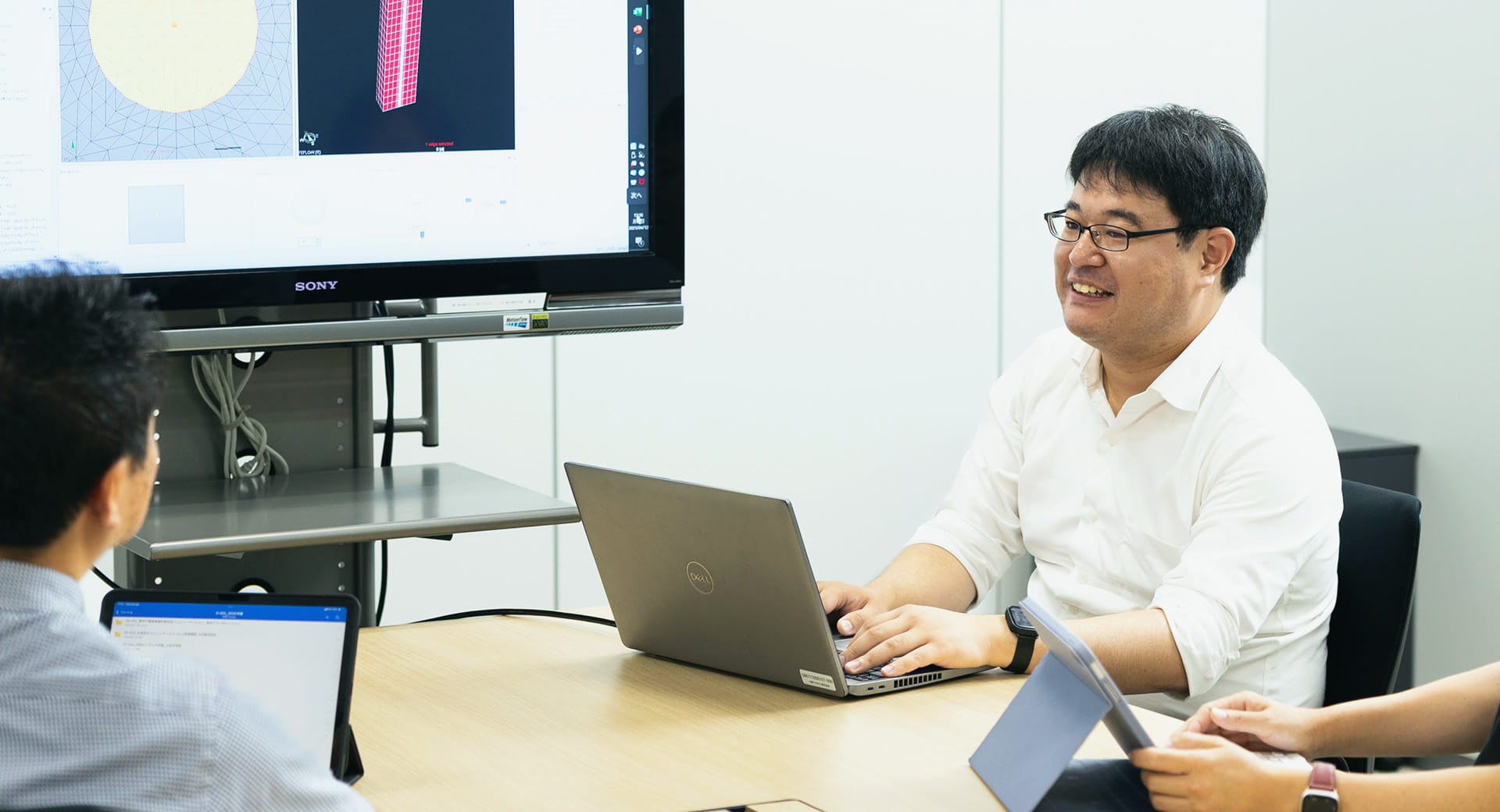 チームのメンバーと、午前中に整理した計算結果を検討するための打ち合わせをします。