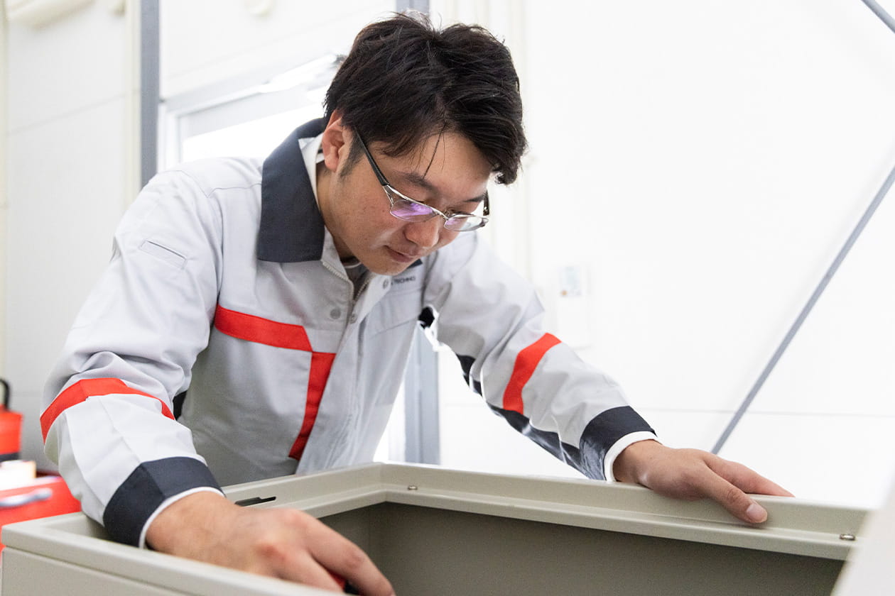 所属する伊万里事業所(※1)では、お客様先のプラント内で新しい装置の立ち上げ工事や入れ替え工事などを担当しています。加えて大学でソフトウェアを学んできた私は、早い段階から、装置内のソフト設計を一から担当させてもらいました。最近は、電気メンテナンスの工事も担当するようになりました。やってみたら、ソフト設計よりも現場に出てメンテナンスをする方が好きだと分かりました(笑)。でも、伊万里事業所にソフト屋は私一人なので、「両方できること」を強みに、早く戦力になりたいと思っています。